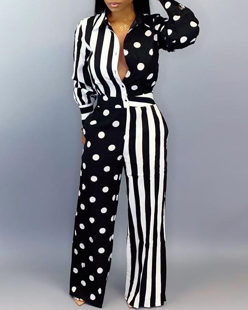 Striped Polka Dot Print Buttoned Wide Leg Jumpsuit